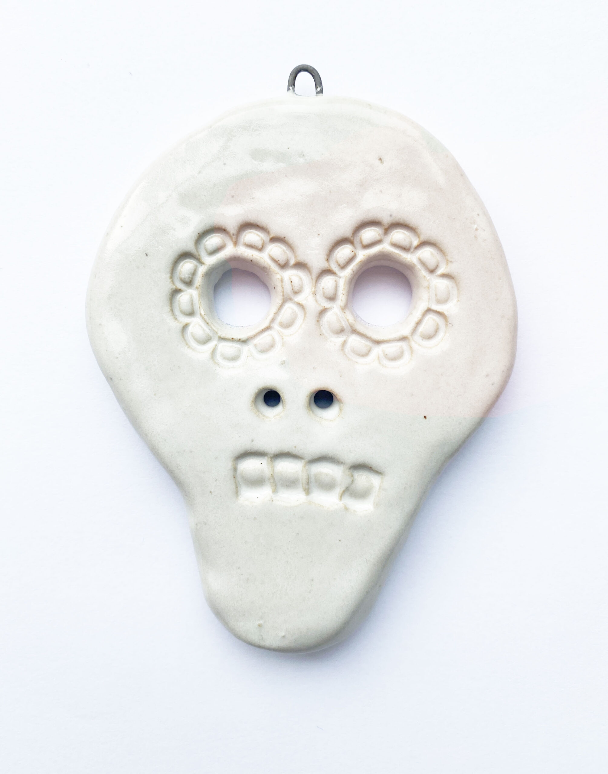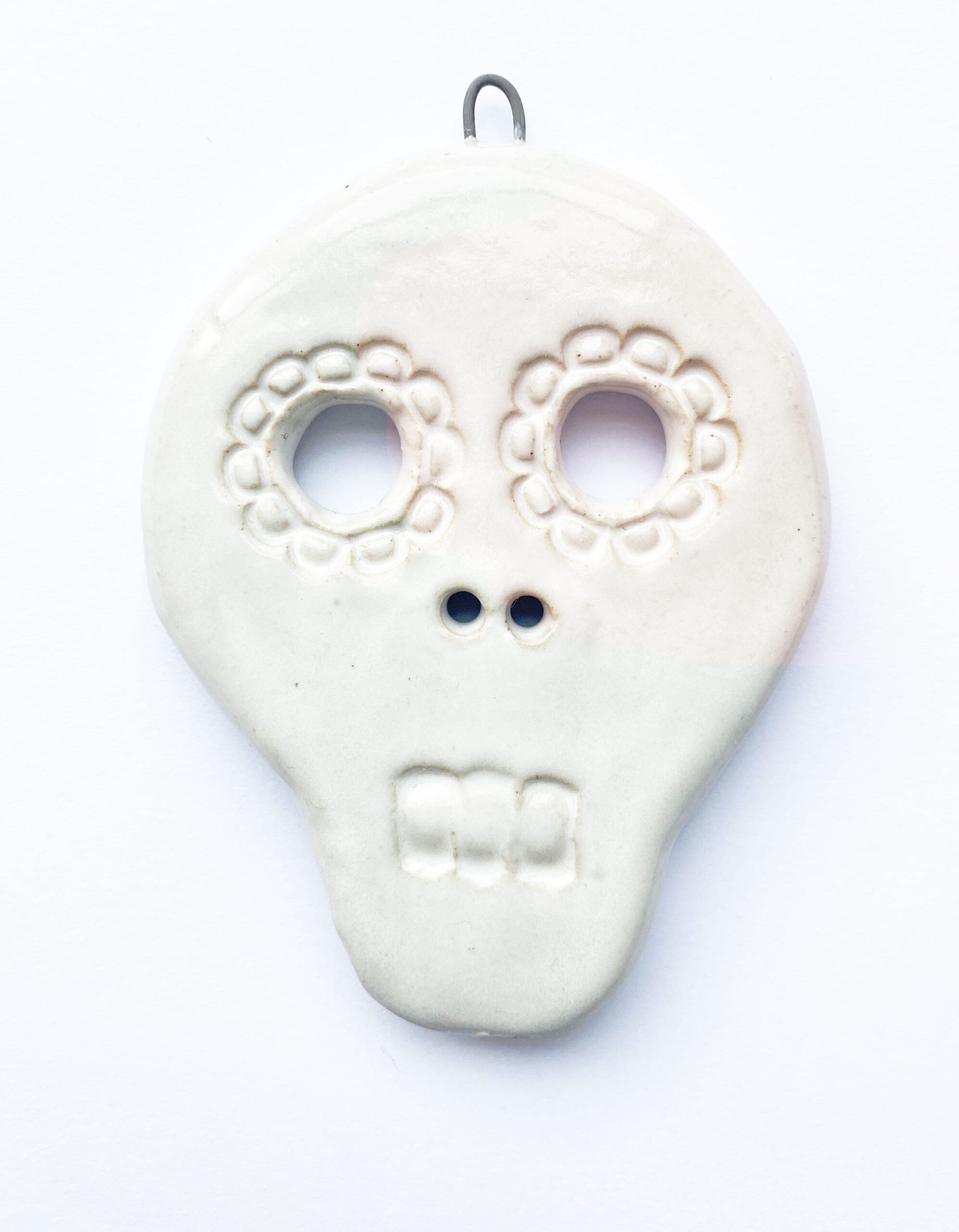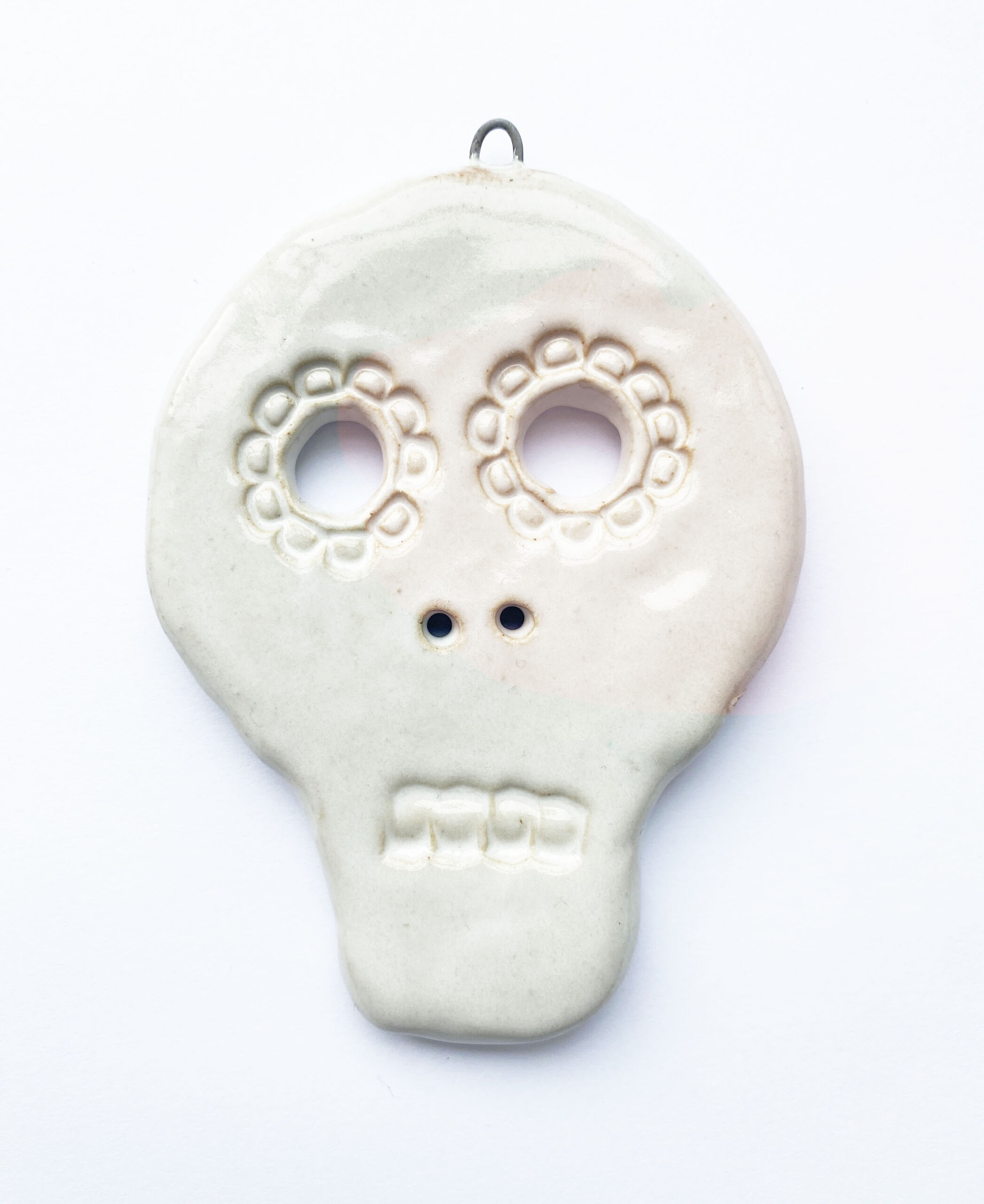 Doodshoofdjes, formaat: vanaf 8 x 6 cm. Klei, wit glazuur, kanthaldraad.