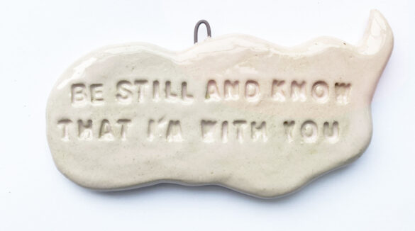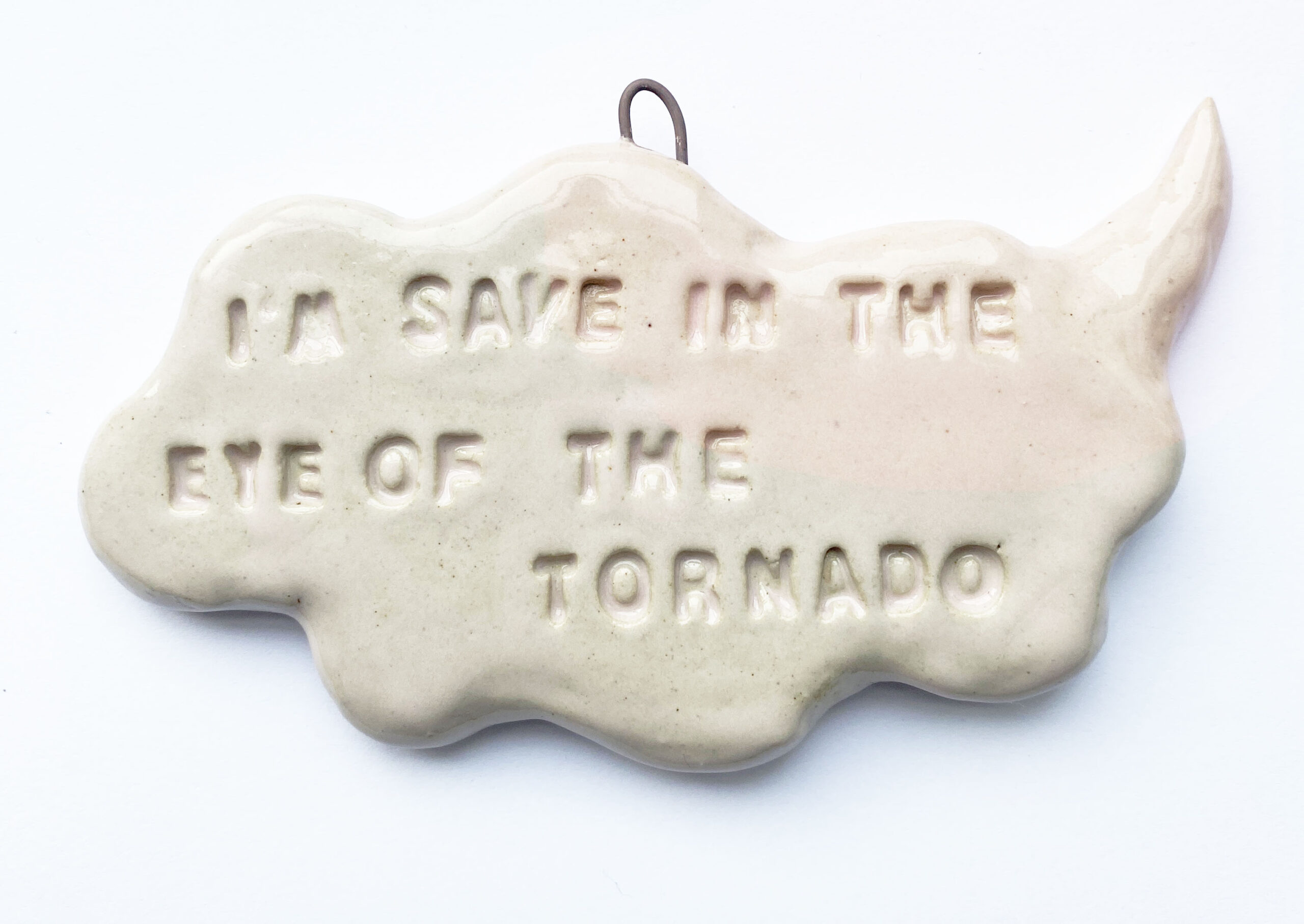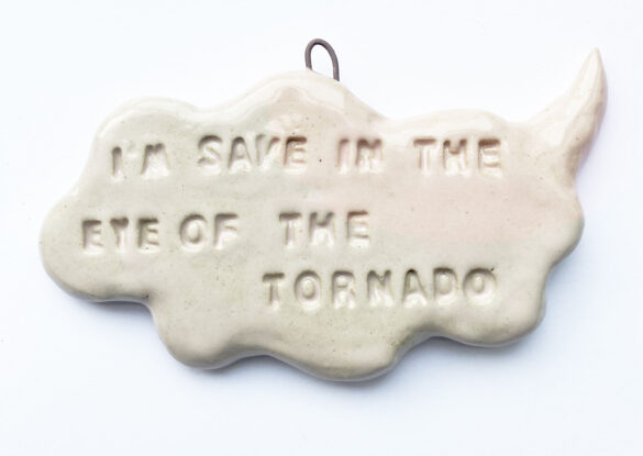 Speechbubbles, formaat: vanaf 10 x 6 x 0,5 cm. Klei, roze glazuur, kanthaldraad.